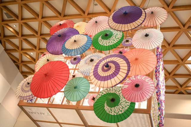 こちらはあわら温泉駅で撮影いたしました。色鮮やかで様々な大きさの傘が天井付近に見えて花のような綺麗さがありました。