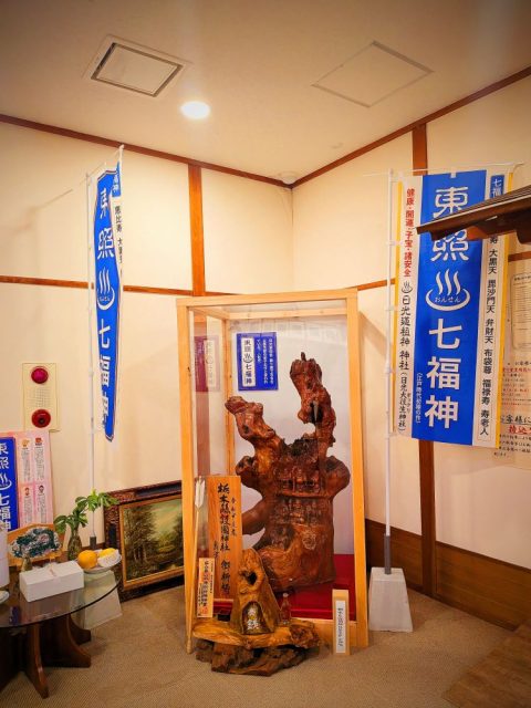 入口横には、七福神の縁起物や御神木などが展示されています。